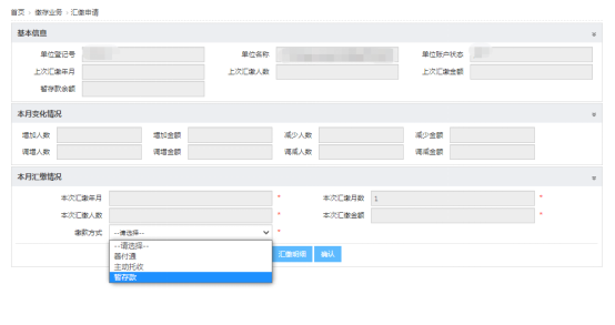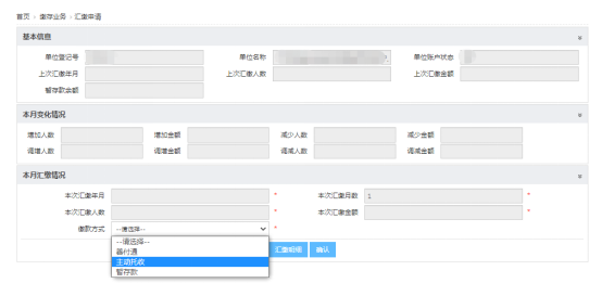 (1)登录广东政务服务网→缴存业务→汇缴申请,选择缴款方式:主动托收。选择主动托收时,将显示付款银行、付款账号、付款账户名称。