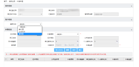 (2)选择需要补缴的员工,选择补缴原因、补缴年月,点击【保存】,选中记录,点击【确认】,提交补缴申请,等待公积金管理机构审批。