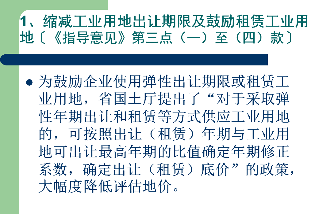 1.先租后让。通过招标拍卖挂牌方式取得土地使用权,采取先租后让方式使用土地的,中标人或竞得人可与国土资源主管部门签订“2+3+N”的土地出让合同,在合同中应分别明确约定2年基建租赁期、3年投产租赁期和N年出让期需缴纳的土地价款、分期届满前需达到的土地使用条件及验收评估要求等。“2+3+N”总年限原则上不得超过20年,对于国家、省重大产业项目、战略性新兴产业项目等,经地级以上市人民政府认定后,以认定的年期先租后让,最高不超过50年。土地受让方应在每个阶段期届满前3个月向出让方提出验收评估申请,出让方应组织相关部门在接受申请后1个月内完成验收评估工作。达到合同约定要求的,受让方可凭借验收评估合格证明办理下一期土地使用手续。缴清全部土地价款的,方可办理不动产权属证书。未达到合同约定要求的,应采取限期整改方式进行处理,整改总期限不得超过1年。整改期满后仍未达到合同约定要求的,由土地出让方无偿收回土地使用权及其地上建筑物、构筑物及其他附属设施。