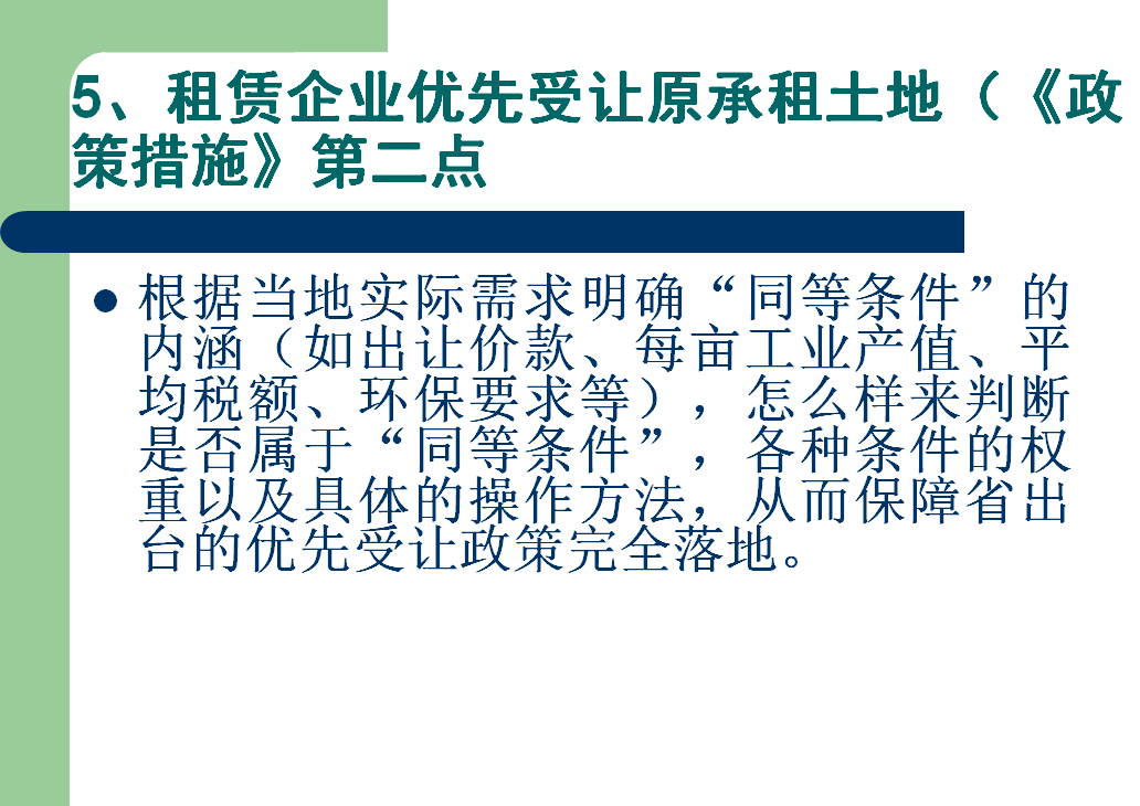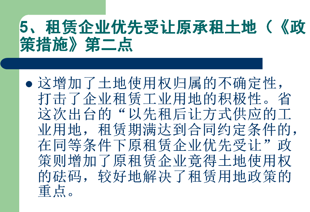 二、降低企业用地成本。各地市要划设工业用地控制线,年度建设用地供应计划要充分保障工业用地供给:“三旧”改造土地及省追加的新增城乡建设用地优先保障先进制造业需求;纳入省相关“十三五”规划的制造业项目享受省重点建设项目待遇。属于我省优先发展产业且用地集约的制造业项目,土地出让底价可按所在地土地等别对应工业用地最低价标准的70%执行。鼓励市、县实行工业用地弹性出让政策,对于采取弹性年期出让供应工业用地的,可按照出让年期与工业用地可出让最高年期的比值确定年期修正系数,对届满符合续期使用条件的,可采用协议出让方式续期。以先租后让方式供应的工业用地,租赁期满达到合同约定条件的,在同等条件下原租赁企业优先受让。省每年安排一定的用地指标奖励制造业发展较好的地市。