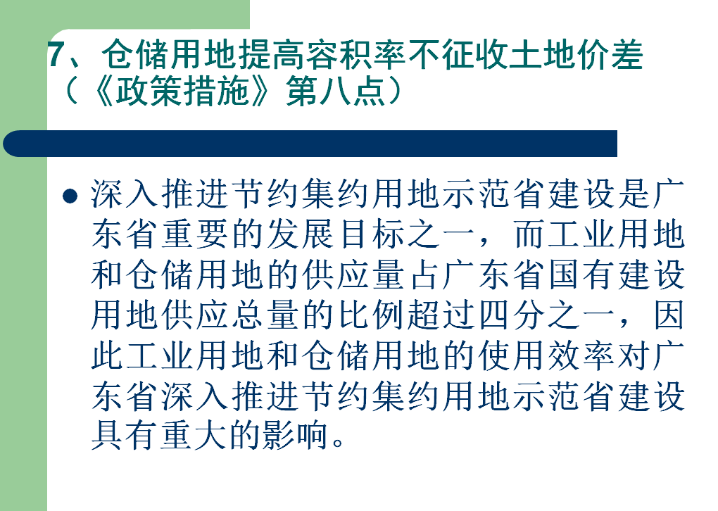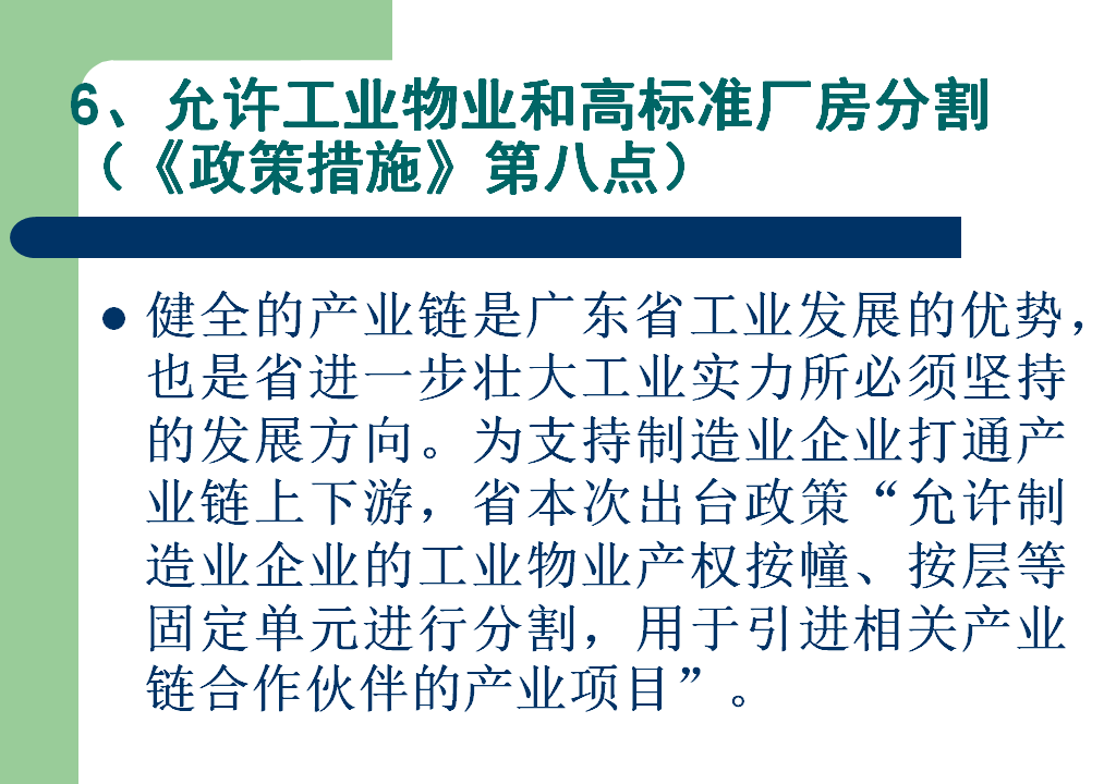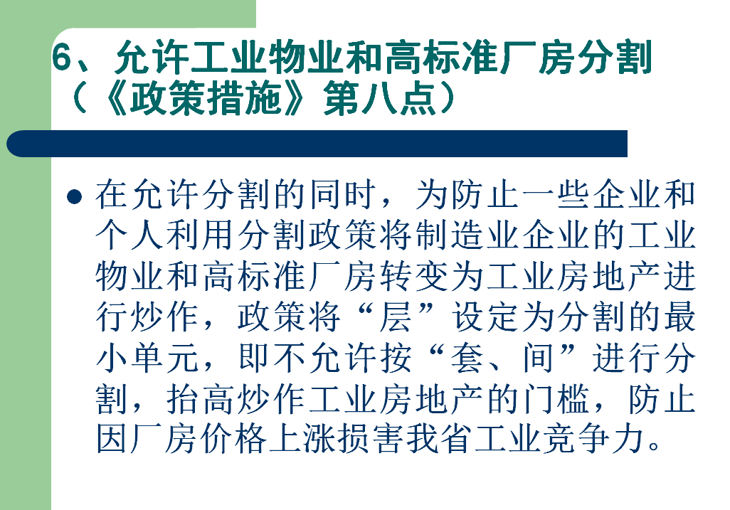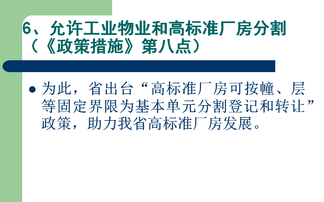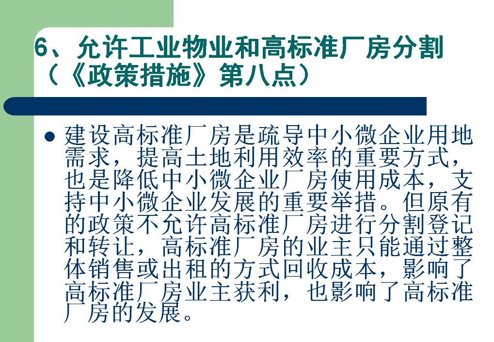 八、支持工业企业盘活土地资源提高利用率。允许制造业企业的工业物业产权按幢、层等固定界限为基本单元分割,用于引进相关产业链合作伙伴的产业项目。在符合规划、不改变用途的前提下,在工业用地、仓储用地上对工矿厂房、仓储用房进行改建、扩建和利用地下空间,提高容积率、建筑密度的,不再征收土地价款差额。支持和鼓励各地建设高标准厂房,高标准厂房可按幢、层等固定界限为基本单元分割登记和转让。支持试点城市解决重点制造业企业用地历史遗留问题,加快完善相关用地手续,所需用地指标在试点城市土地利用年度计划指标中优先安排,所在地不动产登记机构要开辟绿色通道,加快办理不动产登记。