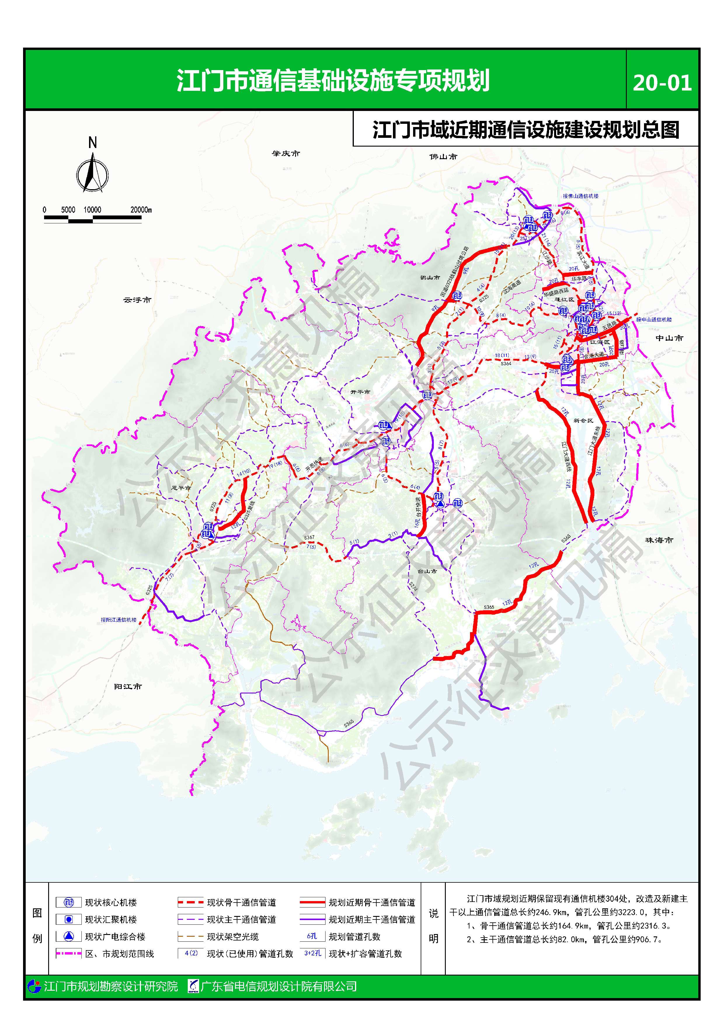 规划江门市域近期建设通信管道(含骨干、主干、次干及配线管道)总长约1126km,管孔公里约9711。