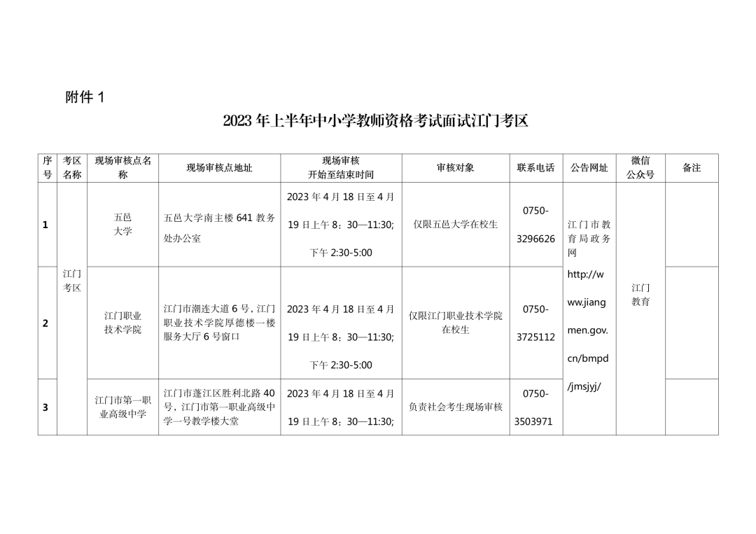 江门考区现场审核时间为2023年4月18日至19日,上午8:30-11:30,下午14:30-17:00。考生网上报名完成后,应持相关证明材料在江门考区指定的地点和时间进行现场审核,现场审核时间、地点、受理对象和联系方式等信息见附件1(其中江门市第一职业高级中学现场审核点由于考生较多,需要预约时间。为便于考生自主选择审核时间,请前往江门教育微信公众号预约取号,按时段取号顺序进行审核,网上预约操作流程:关注“江门教育”公众号,点击打开“掌上服务”,点击“教师资格面试预约”按指引预约。预约功能从2023年4月14日09:00分起开放)。