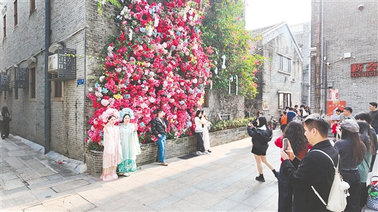 市民游客在长堤历史文化街区打卡拍照。任佳燕 摄