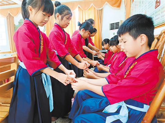在恩平“侨童学堂”,侨童们在茶艺室习茶礼。