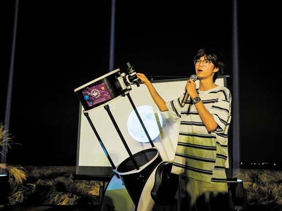 入夜,稻田更加热闹了。五邑大学天文协会的学生们带来天文望远镜等仪器,和当地村民一起观星望月,感受大自然的美好。