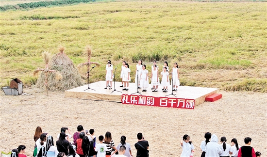 在旖旎的田园风光中,礼乐中心小学、威东村、五四村、乐中园等多支民间舞蹈队自主编排节目,包含舞蹈、器乐、合唱、独唱等多种艺术形式,以实际行动为乡村文旅赋能,展现“百千万工程”的成果。稻田里的舞台前,观众们或驻足悠闲聆听,或打卡拍照留影。