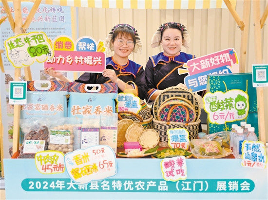 江门日报讯 (文/图 记者/陈婵 通讯员/区农水) 11月30日至12月1日,“大新‘桂’品,礼遇江门”2024年大新县名特优农产品(江门)展销会在江海广场举办,集中展示广西崇左市大新县巩固拓展脱贫攻坚成果同乡村振兴有效衔接工作成果,推动大新“桂”品进入大湾区。