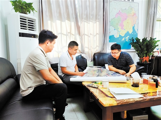 熊英(右一)与村干部谋划陈山村高质量发展蓝图。