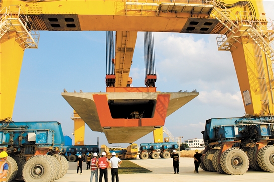 为加快融入“轨道上的大湾区”,鹤山市全力推动珠肇高铁鹤山段建设。图为今年3月27日,珠肇高铁全线首榀箱梁在鹤山顺利完成架设,标志着项目正式进入箱梁架设施工阶段。