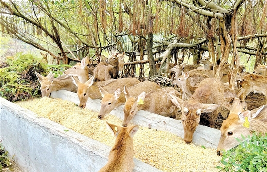 甜象草、胡萝卜、玉米秸秆、花生秧……对于喂养梅花鹿的饲料和枝叶,胡星卫都亲力亲为。“鹤山林地、植被资源丰富,我们在这片承包地里就地取材,梅花鹿很喜欢吃这些。通过绿色养殖、悉心照料,才能产出高附加值的鹿茸及鹿副产品。”胡星卫说。