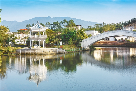 七斗公园碧水流淌,拱桥与凉亭相映成趣。