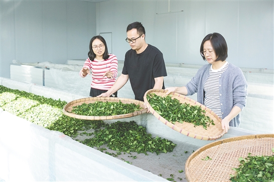 靖村村的康铭尖茶小有名气,曾在江门市茶叶协会首届茶叶评鉴活动中斩获一等奖。图为来自广东省农业科学院茶叶研究所的博士指导当地茶叶制作工艺,结合摇青工艺助力创制花香红茶。