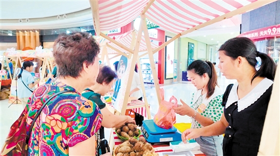市民在展销会上购买天等县特色农产品。