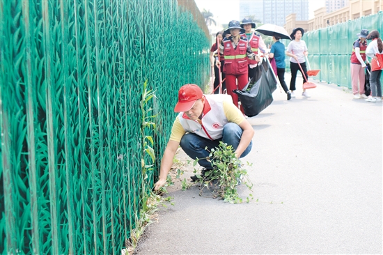 党员志愿者与网格员清理围蔽栏周围的杂草和垃圾。