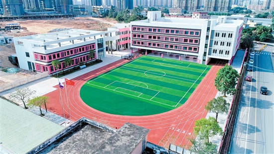 台山市去年累计投入4800余万元,大力推动台城二小林荣源校区改扩建工程、那琴小学教学楼项目等建设。图为改扩建后的台城二小林荣源校区。