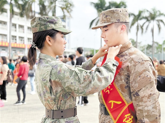 在欢送仪式现场,老兵姐姐为新兵弟弟整理军装。