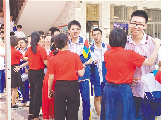 考前,老师与考生击掌拥抱,给予他们温暖与力量。