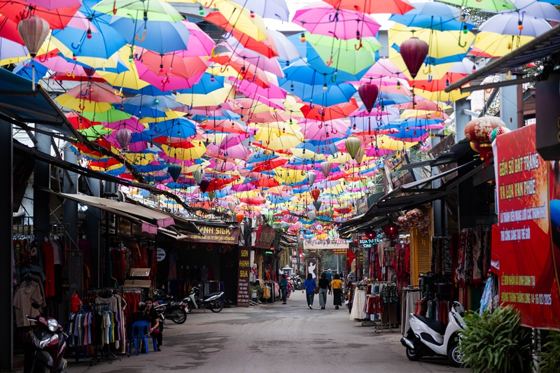 2025年3月26日,游客在越南河内的万福丝绸村游览。新华社记者 朱炜 摄