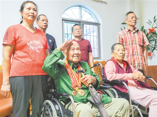 在鹤山市鹤城镇的家中,抗战老战士黄光华一边观看阅兵仪式直播,一边用右手敬礼。 张泽彬 摄