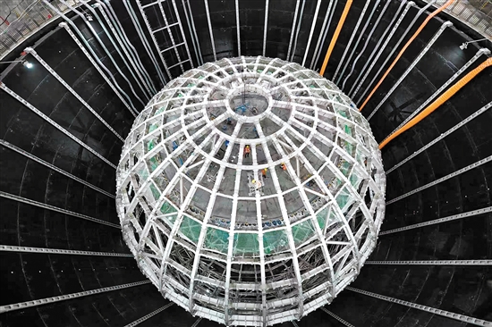 工作人员在进行江门中微子实验核心探测设备不锈钢主结构的安装。