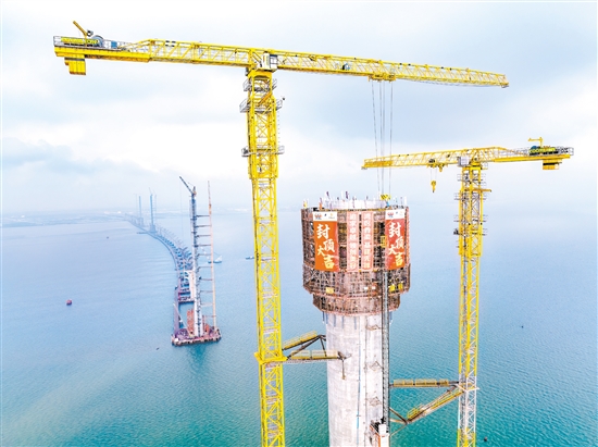 4月18日,记者从广东交通集团了解到,《粤港澳大湾区发展规划纲要》发布后首个开工建设的跨海通道工程——黄茅海跨海通道建设取得重大突破,海上主桥最后一座主塔——黄茅海大桥中塔顺利封顶(见右图)。此次封顶的中塔高263.78米,相当于80多层楼高,是五座主塔中高度最高、截面形变最剧烈、直径最大、施工工艺最为繁杂的一座主塔。至此,黄茅海跨海通道关键控制性工程黄茅海大桥和高栏港大桥五座主塔全部封顶,项目建设进入斜拉索安装和钢箱梁架设新阶段。