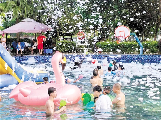 当天下午5点多,记者在新会龙泉酒店沙滩泳场看到,色彩缤纷的水上游乐设施上满是在戏水的大人和小孩,各种款式不一的水上滑梯和水帘装置也为孩子们带来了清凉愉悦的游玩体验。