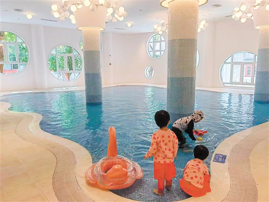 赤坎华侨古镇巢栖亲子酒店里,儿童玩乐区、戏水池等配套设施一应俱全。