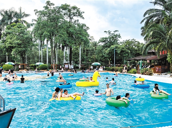 游客们在温泉池中游玩戏水,畅享假日美好时光。