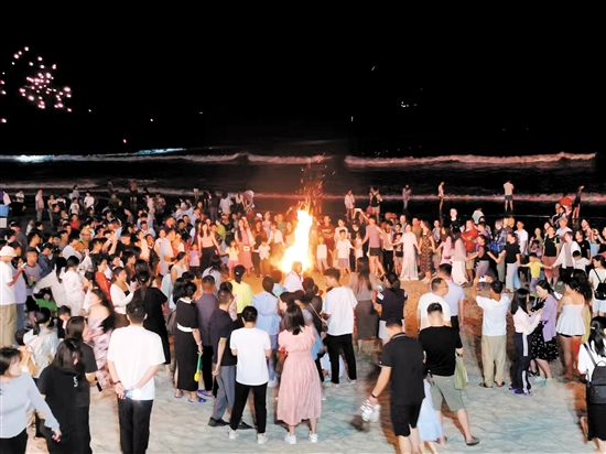 游客在川山群岛旅游度假区的海滩上载歌载舞。