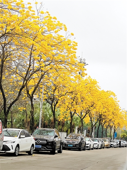 蓬江区天长路的黄花风铃木璀璨夺目。