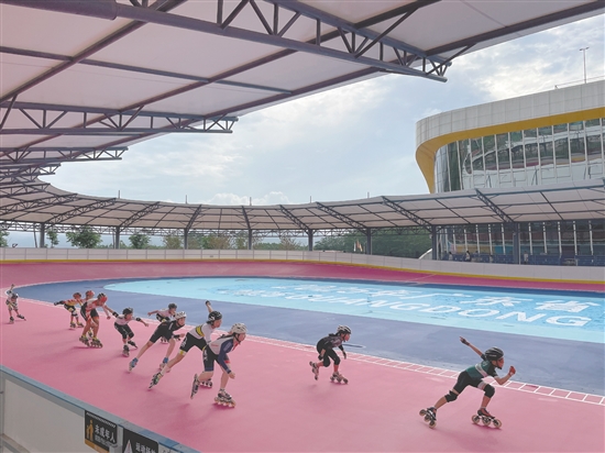 在恩平市全民健身中心和新体育公园,比赛选手正在200米轮滑场进行训练。吴健争 摄