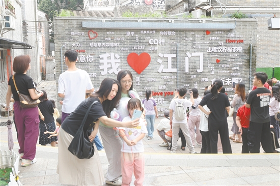市民游客在启明里的“我爱江门”地标前拍照留念。罗霈 摄