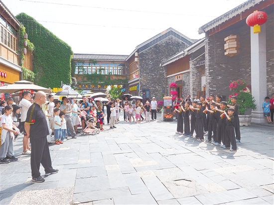 咏春会馆门口,一阵激昂的音乐声响起,原来是一群咏春学徒在展示咏春套路。一招一式尽显鹤山咏春风采,赢得游客们的鼓掌和喝彩。咏春表演结束后,游客们走进咏春会馆参观,大家纷纷化身“咏春高手”,在馆内摆放的木人桩前摆好架势拍照留念,现场展示的香火龙头也频繁入镜。