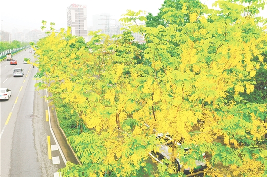 记者在市区白石大道看到,道路两旁腊肠花树繁花满缀。一串串、一簇簇黄色碎花在绿叶映衬下明艳夺目,引得过往市民纷纷驻足,掏出手机记录下这迷人的风景。
