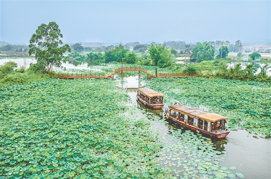 据介绍,横海浪自然生态区荷花自5月底起陆续绽放,6月进入最佳赏花期。连日来,浓浓荷韵吸引众多市民游客前来打卡,大家乘坐游船穿行于荷花之间,用手机、相机定格美景。景区内,生机勃勃的荷塘与岭南风情小镇相映成趣,形成一幅生态水乡画卷,让市民游客尽享水乡慢生活。