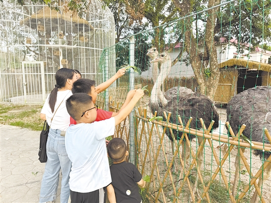 国庆假期,位于台山市三合镇的凤乡玉怀民宿迎来了一批来自大湾区的亲子游客。孩子们在动物长廊里兴致勃勃地喂食鸵鸟、目不转睛地观察孔雀开屏;家长们则提着竹篮走进菜园,亲手采摘新鲜有机蔬菜;“田园导师”在一旁耐心指导游客制作艾糍等台山传统小吃。