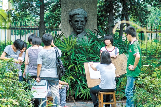 学生们在李铁夫铜像前写生。