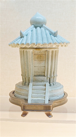 “这个宋代影青瓷谷仓是国家二级文物,它形如当时的仓库,是古时随葬之物,古人以其随身入葬寄托对逝者之祈悼,祈愿逝者在阴间丰衣足食、五谷不缺。”新会区博物馆宣教展览部工作人员李国良解说道,它的釉质晶莹细润,釉色白中泛青,整体虽小巧玲珑,却雕琢精细,再现浓郁的古时民俗生活气息,反映了宋代顺昌农业生产,是彼时粮食丰收的缩影和百姓生活富足的写照。