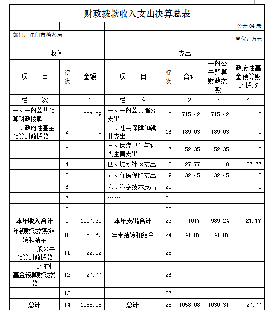 江门市档案局2015年度总收入1,078.72万元,其中本年收入1,028.03万元。具体情况如下: