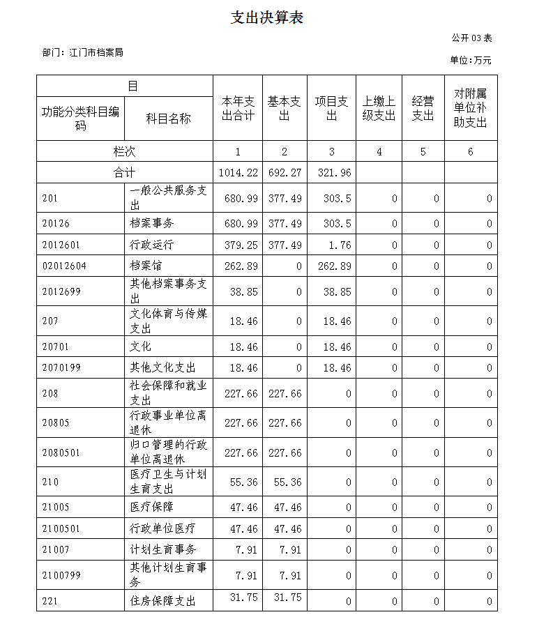 江门市档案局2016年度总支出1300.80万元,其中本年支出1014.22万元。具体情况如下: