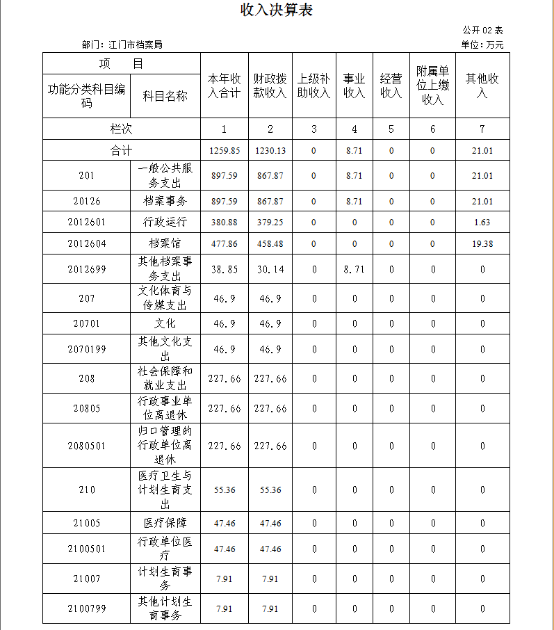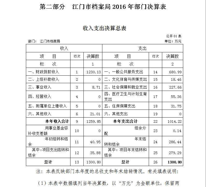 江门市档案局2016年度总收入1300.80万元,其中本年收入1259.85万元。具体情况如下: