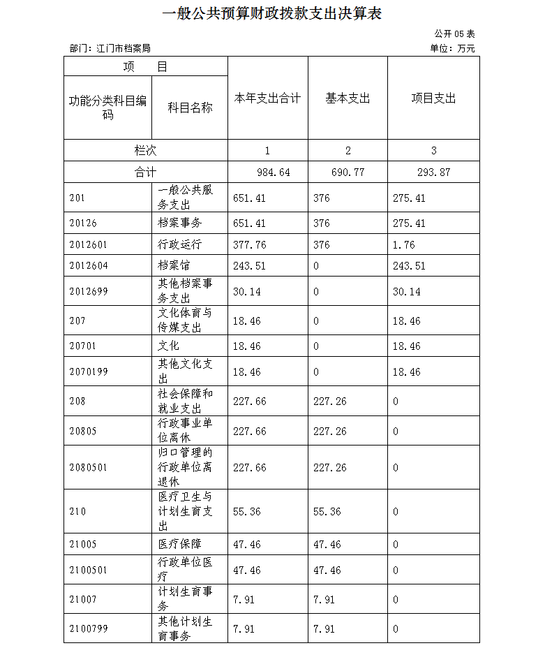江门市档案局2016年度一般公共预算财政拨款支出984.64万元,具体情况如下: