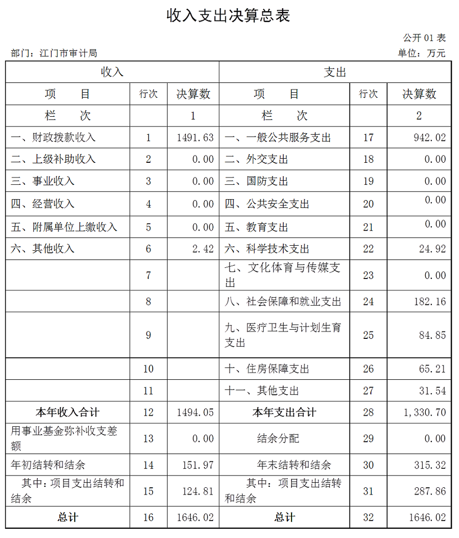 江门市审计局2016年度总收入1646.02万元,其中本年收入1494.05万元。具体情况如下: