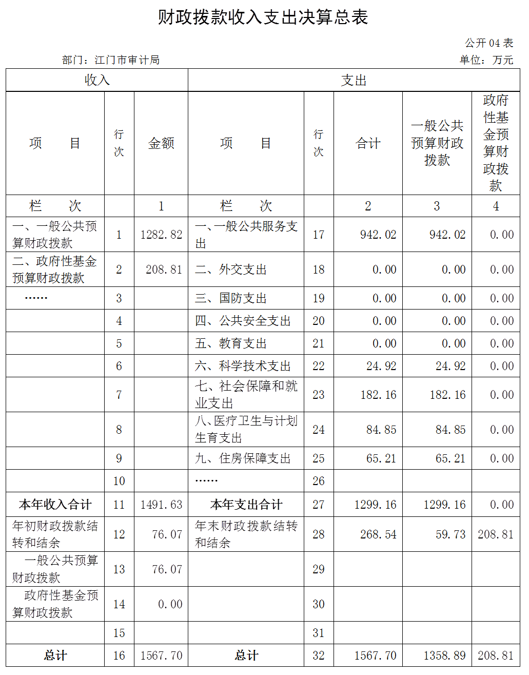 江门市审计局2016年度财政拨款收入合计1491.63万元。其中:一般公共预算财政拨款收入1282.82万元,比年初预算数增加208.17万元,增长16.23%,主要原因一是增加了审计项目经费;二是增加了人员经费。政府性基金预算财政拨款收入208.81万元,比年初预算数增加208.81万元,增长100%。