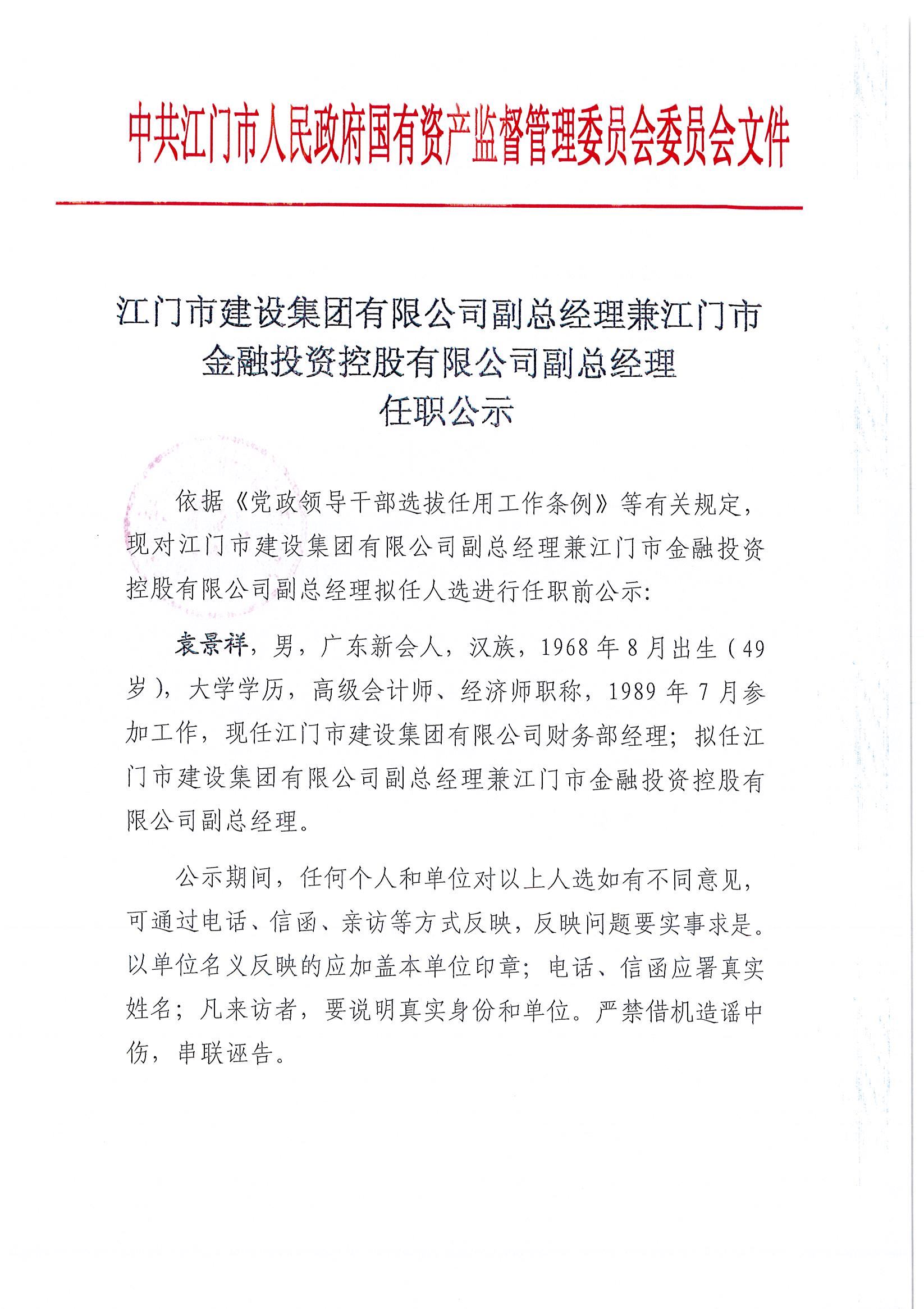 江门市建设集团有限公司副总经理兼江门市金融投资控股有限公司副总经理任职公示