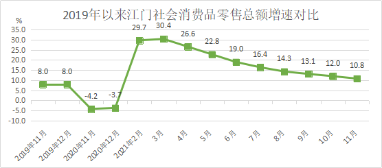 1-11月,我市消费市场保持平稳,全市实现社会消费品零售总额1178.39亿元,同比增长10.8%;比2019年同期增长6.1%,两年平均增长3.0%。