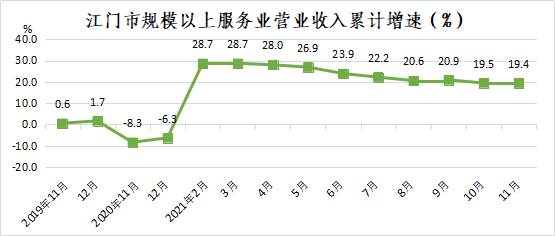 1-11月,全市规模以上服务业营业收入突破200亿元,为200.03亿元,同比增长19.4%,两年平均增长11.4%。