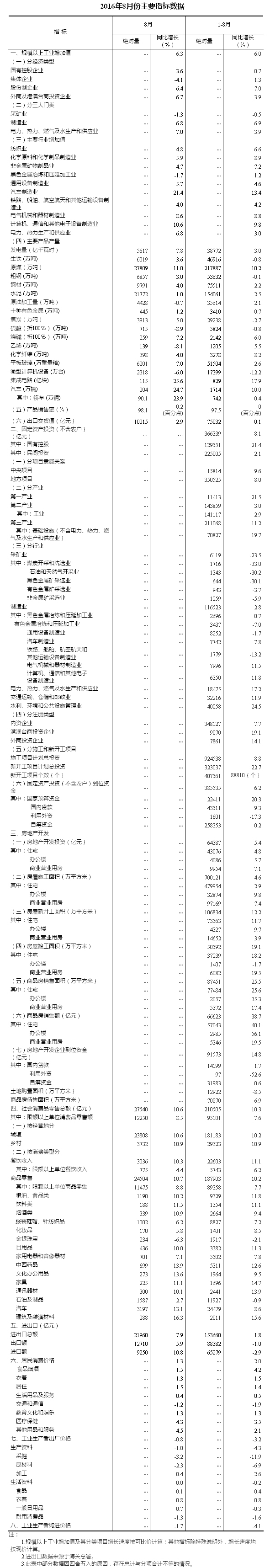 8月份,全国规模以上工业增加值按可比价格计算同比增长6.3%,增速比上月加快0.3个百分点,比上年同期加快0.2个百分点。分经济类型看,国有控股企业增加值同比增长3.6%,集体企业下降4.1%,股份制企业增长6.4%,外商及港澳台商投资企业增长6.7%。分三大门类看,采矿业增加值同比下降1.3%,制造业增长6.8%,电力、热力、燃气及水生产和供应业增长7.0%。工业结构继续优化,高技术产业和装备制造业增加值同比分别增长11.8%和10.8%,增速分别比规模以上工业快5.5和4.5个百分点。规模以上工业企业产销率达到98.1%。从环比看,8月份全国规模以上工业增加值比上月增长0.53%。1-8月份,规模以上工业增加值同比增长6.0%。