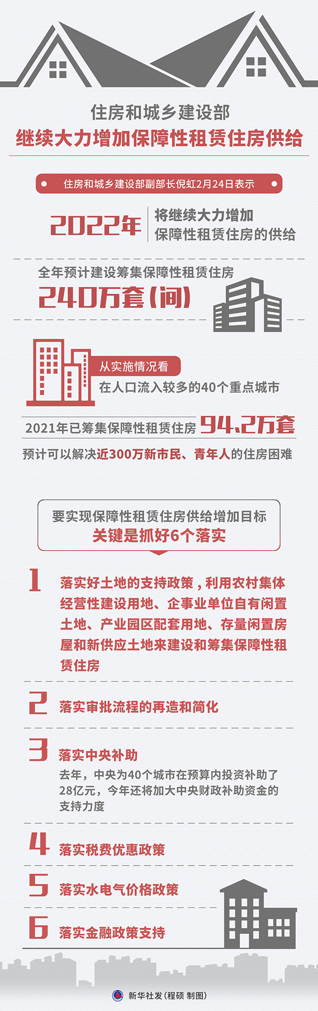 住房和城乡建设部副部长倪虹2月24日表示,2022年,将继续大力增加保障性租赁住房的供给,全年预计建设筹集保障性租赁住房240万套(间)。